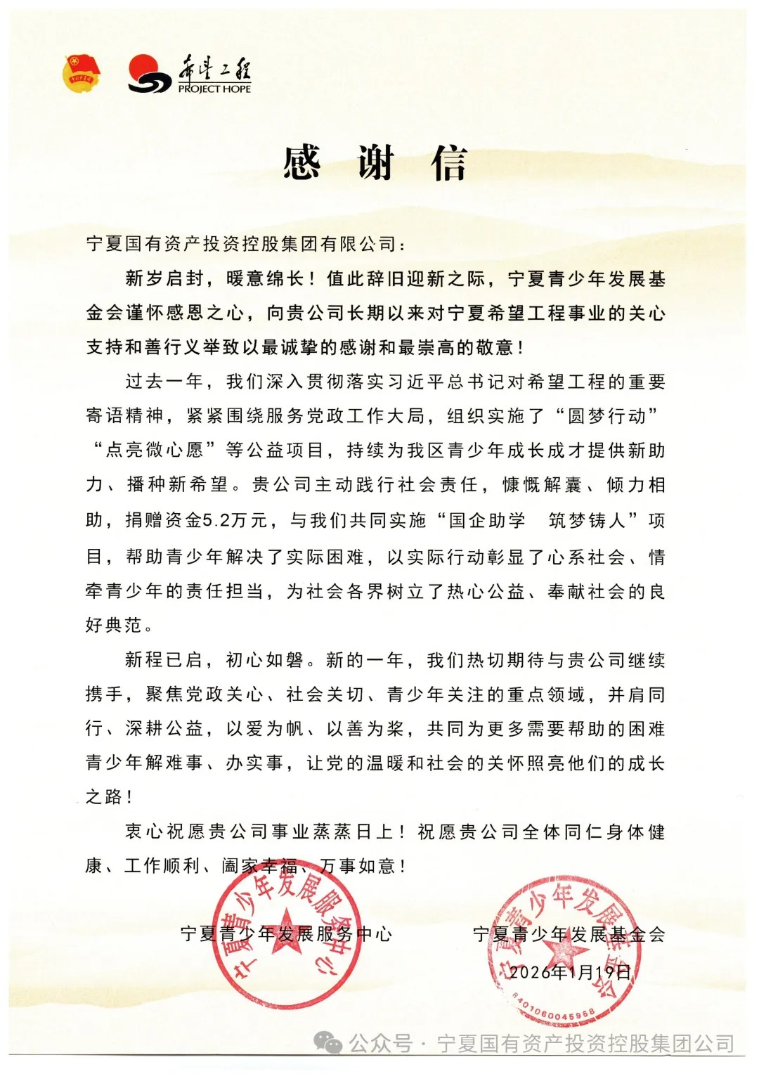 近日,宁夏菲律宾亚星官方网集团收到宁夏青少年发展服务中心、宁夏青少年发展基金会发来的感谢信,对集团长期支持希望工程事业、积极履行社会责任致以诚挚感谢和崇高敬意。